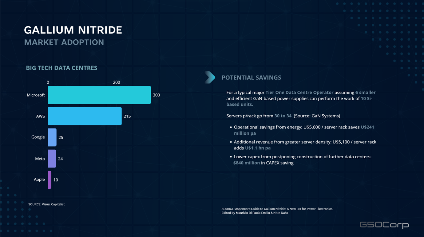 Research from Aspencore on the potential effect of replacing 10 silicon-based power supplies with 6 GaN based power units. As a reminder this example is for 1 x Tier One Data Centre. There are over 500 in the US alone with similar numbers through Europe, Asia and China. The addressable market is suitably large.