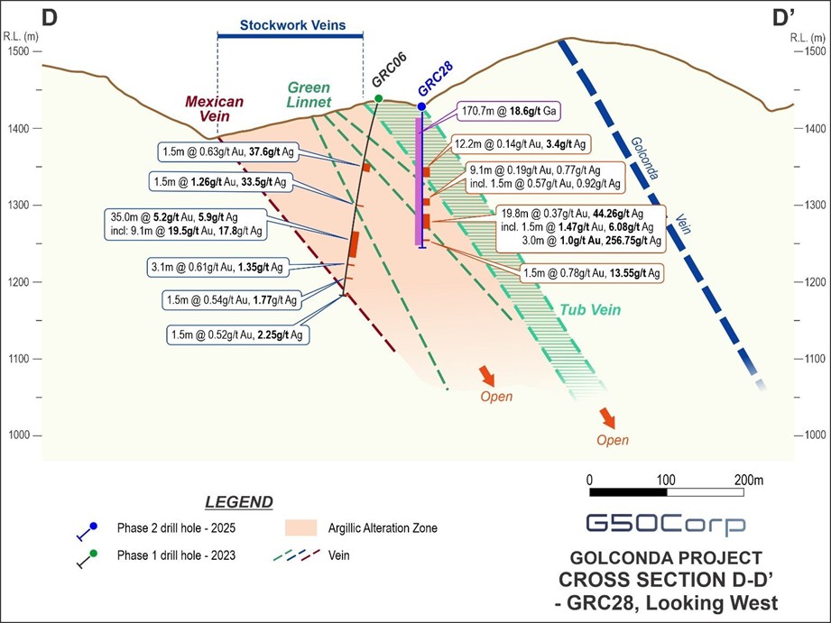 - GRC17 (-75/014) was drilled to test the intersection of the Golconda and Tub Veins Includes: