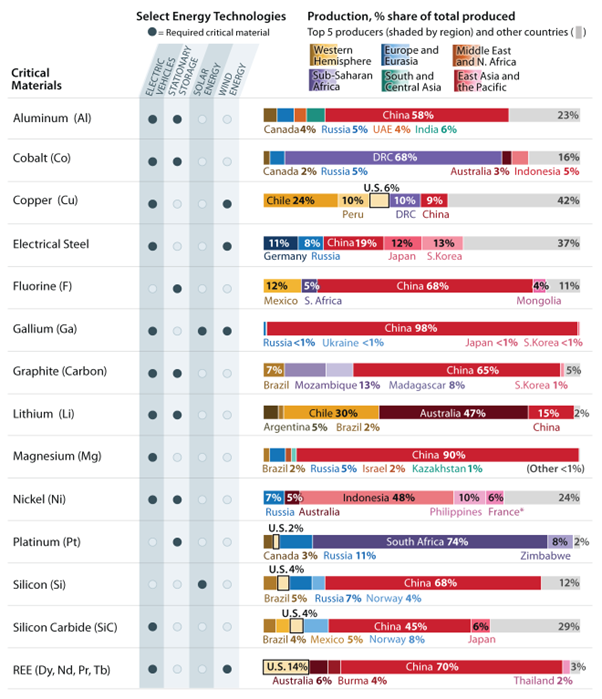 Source: CRS using data from U.S. Geological Survey, Mineral Commodity Summaries 2023, January 31, 2023, https://doi.org/10.3133/mcs2023 and U.S. Department of Energy, Critical Materials Assessment, July 2023, https://www.energy.gov/sites/default/files/2023-07/doe-critical-material-assessment_07312023.pdf.